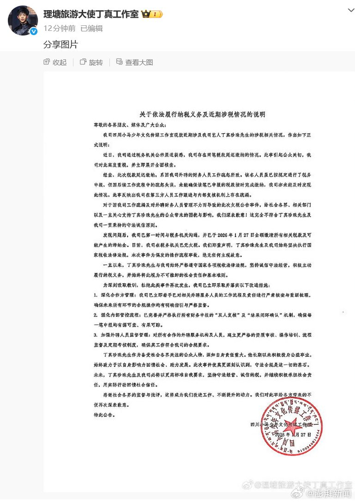 丁真工作室回应欠税公告:延迟缴税系外聘财务粗心