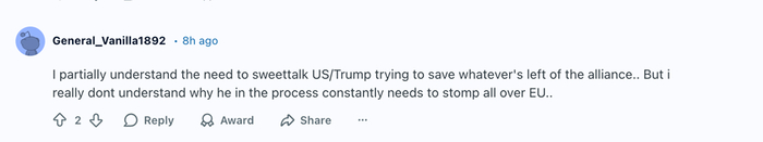 “我部分理解需要向美国/特朗普示好以试图维系残存的同盟关系……但我实在不清楚,为何他非要在这一过程中不断贬低欧盟。”↓