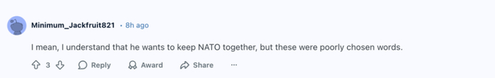 “我理解他试图维持北约团结,但这样的措辞确实欠妥。”↓